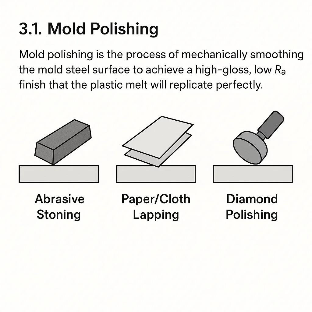 - Lucidatura dello stampo: Per le parti con finitura a specchio (gradi SPI A) è necessaria una lucidatura di precisione con pasta diamantata o pietre abrasive.