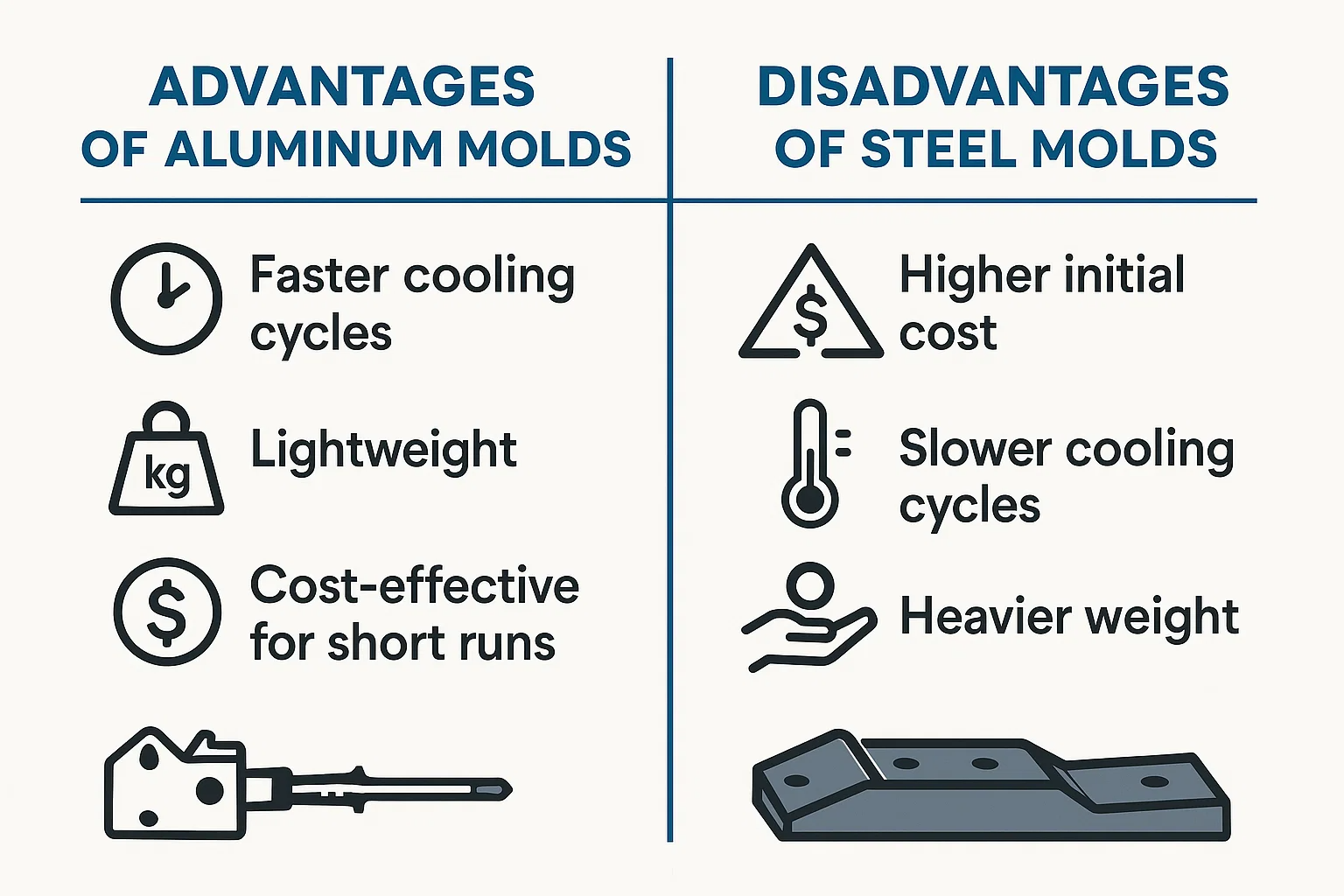 Questo è dove stampi in alluminio brillare veramente. I trasferimenti di alluminio si riscaldano fino a cinque volte più velocemente dell'acciaio. Questa alta conducibilità termica significa che lo stampo si raffredda significativamente più velocemente, il che riduce drasticamente i tempi di ciclo e aumenta la velocità di produzione. Stampi in acciaio , al contrario, conservare il calore più a lungo, portando a un raffreddamento più lento e un tempo di ciclo complessivo più lungo.