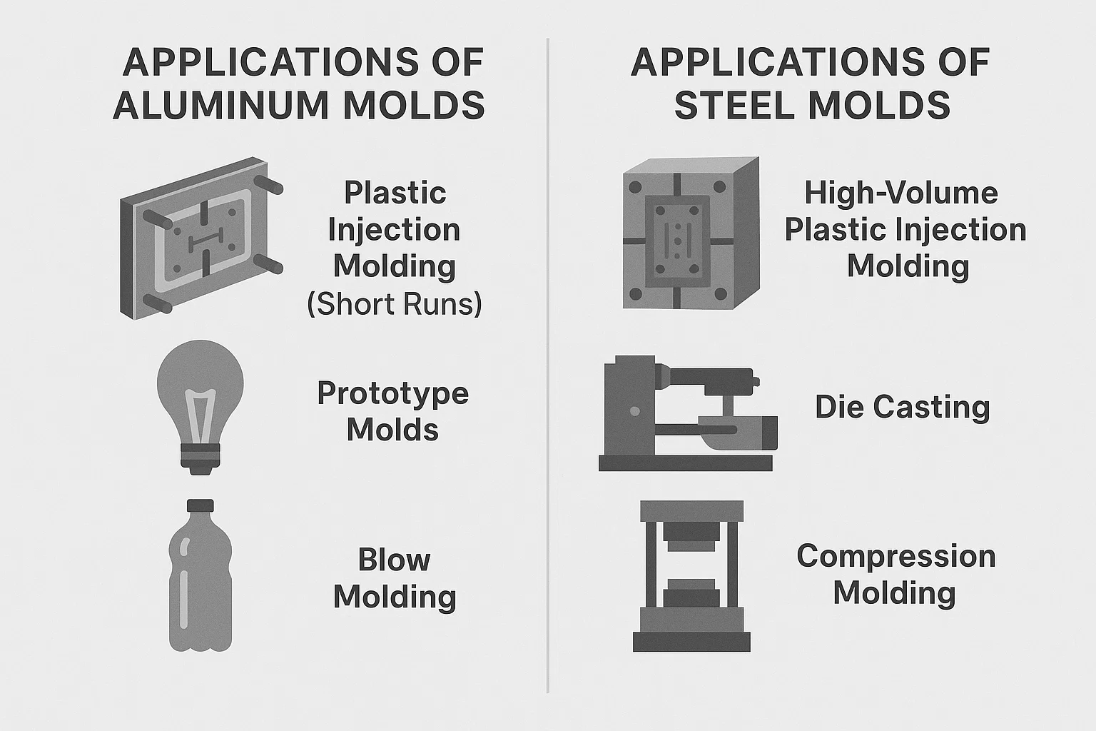 Stampaggio a iniezione di plastica (brevi corse): L'alluminio è perfetto per i progetti in cui hai bisogno di un numero limitato di parti, da poche centinaia a decine di migliaia. I suoi rapidi tempi di ciclo lo rendono un punto lavori di inversione rapida e test del mercato iniziale.