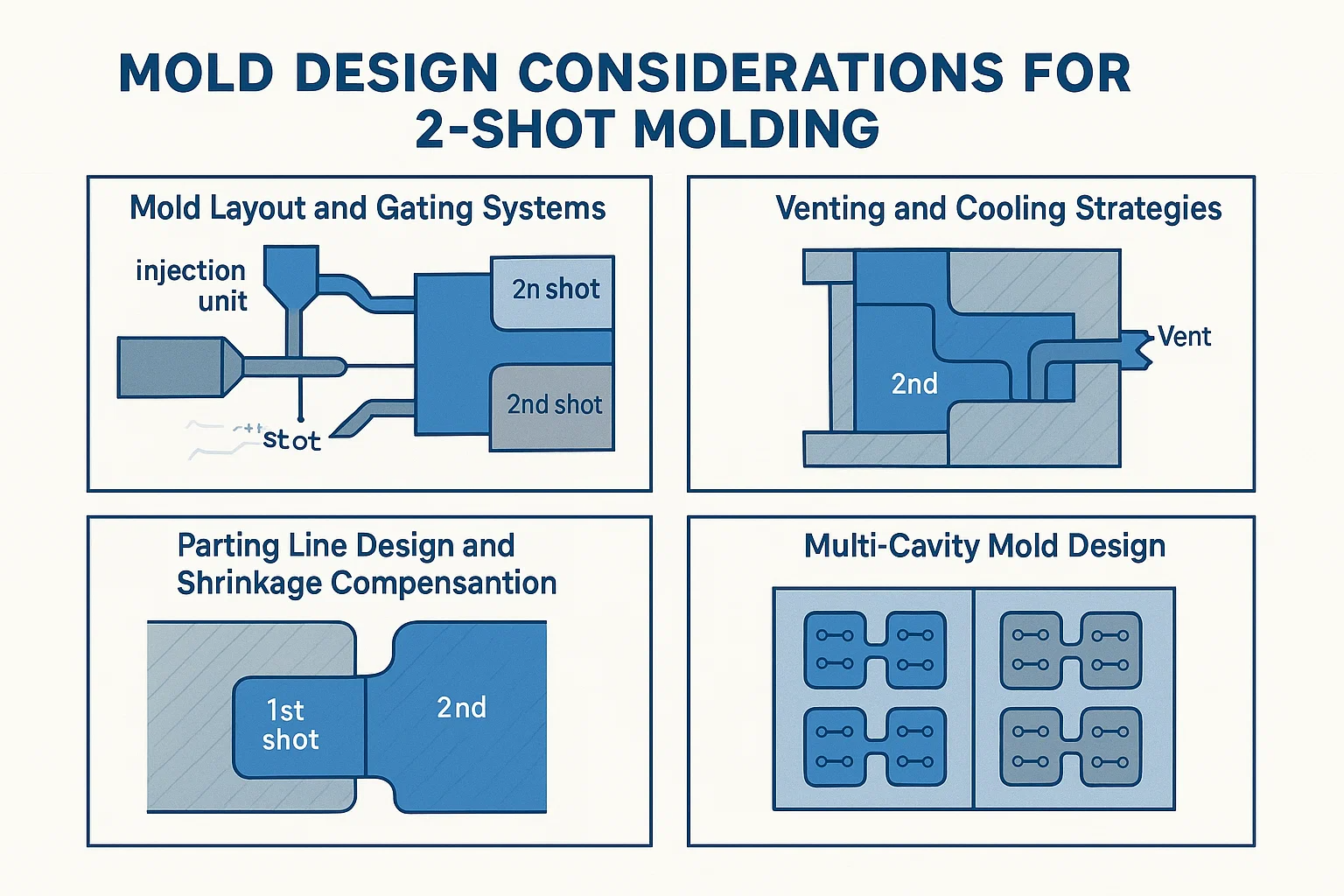 Efficace sfogo è cruciale in tutte le modanature a iniezione, ma diventa ancora più critico nello stampaggio a 2 shot. Poiché il secondo materiale viene iniettato attorno alla parte del primo colpo, l'aria può facilmente rimanere intrappolata in piccole tasche, portando a difetti come segni di bruciatura, colpi corti o legami incompleti. Il design dello stampo deve includere prese d'aria posizionate strategicamente per consentire a quest'aria di fuggire.