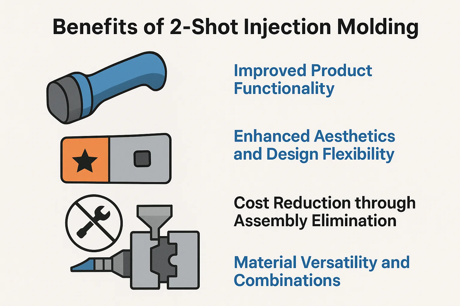 Uno dei vantaggi più significativi dello stampaggio a 2 colpi è la sua capacità di migliorare la funzionalità di un prodotto combinando materiali con proprietà diverse. Ad esempio, un termoplastico rigido può formare il corpo strutturale di un prodotto, mentre un elastomero termoplastico morbido (Tpe) è sovrastimato su di esso per creare una presa comoda e non slittata. Questa tecnica è essenziale per gli utensili elettrici, l'elettronica di consumo e gli strumenti medici in cui l'ergonomia e la sensazione tattile sono fondamentali. Inoltre, il processo è ideale per la creazione di sigilli, guarnizioni e cerniere viventi integrate, che migliorano la durata, l'impermeabilizzazione e le prestazioni complessive di un prodotto senza la necessità di componenti separati che potrebbero fallire nel tempo.