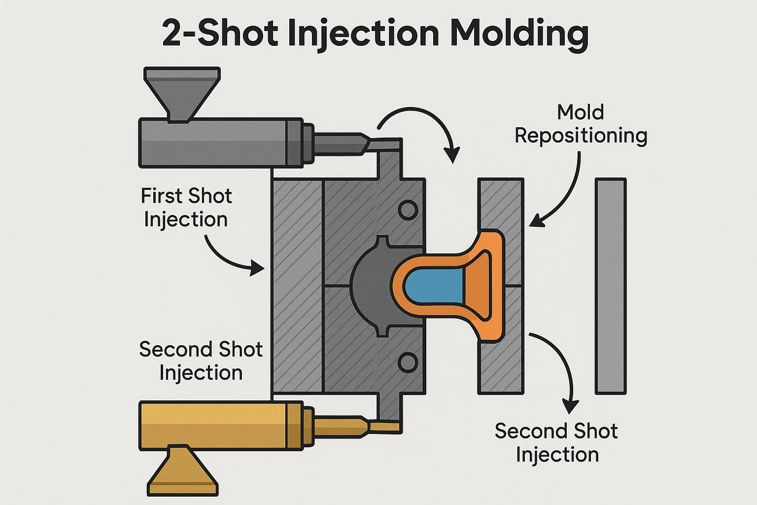 Il viaggio di una parte modellata a 2 colpi inizia con due unità di iniezione separate che alimentano materiali diversi in uno stampo singolo specializzato. Il processo si svolge come un ciclo sincronizzato: