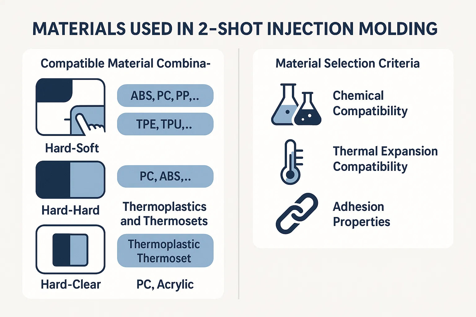 Il successo di qualsiasi progetto di stampaggio a iniezione a 2 colpi dipende dall'attenta selezione di materiali. I due polimeri non devono solo soddisfare i requisiti funzionali ed estetici del prodotto finale, ma anche essere compatibili tra loro per formare un legame forte e duraturo. Questa sezione esplora i tipi di combinazioni di materiali e i criteri critici per selezionarli.