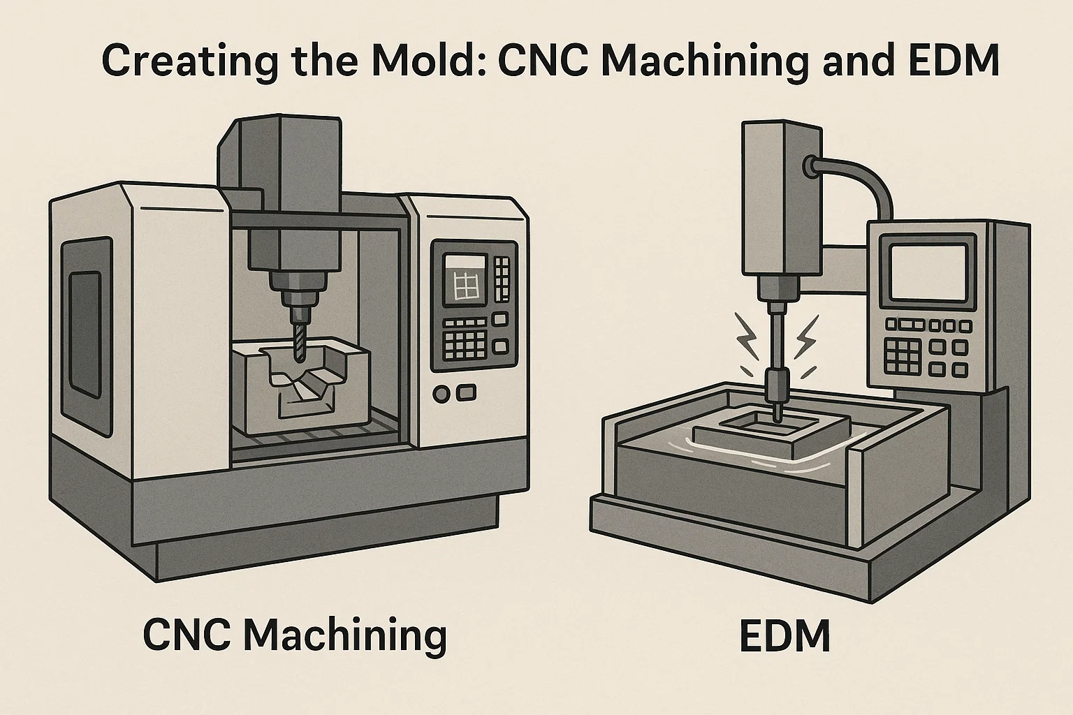 La creazione di uno stampo segue in genere un approccio sinergico, combinando sia il CNC che EDM: