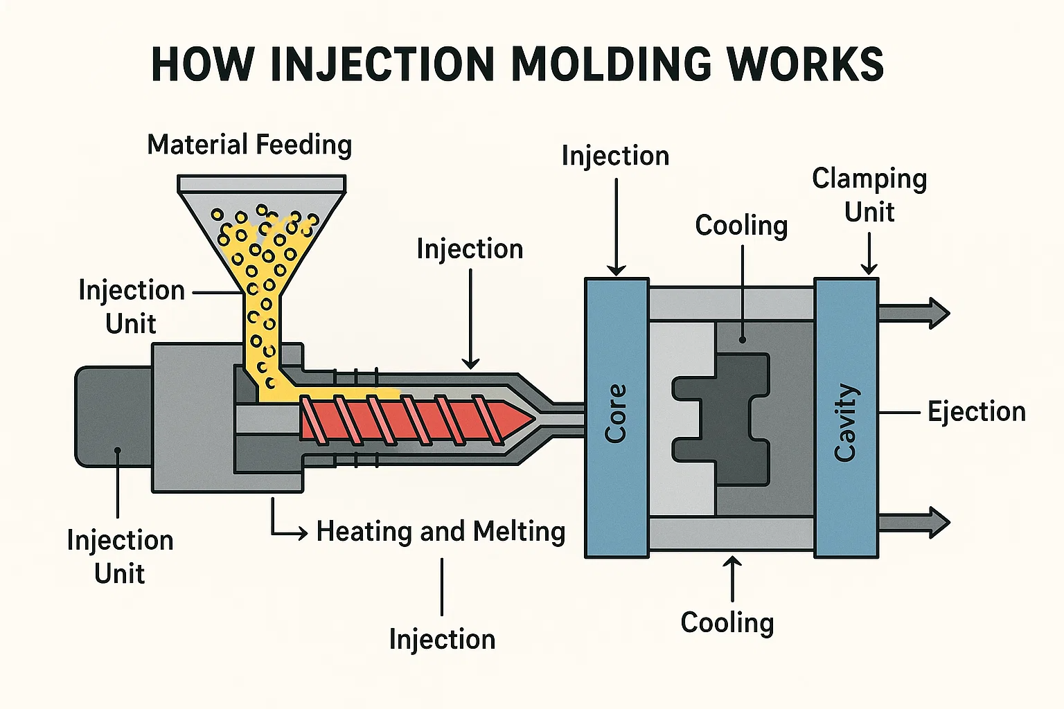 Immagina un processo altamente controllato e automatizzato che trasforma i pellet di plastica grezza in un componente perfettamente modellato in pochi secondi. Questo è essenzialmente ciò che accade durante lo stampaggio a iniezione. Il processo può essere suddiviso in diverse fasi chiave: