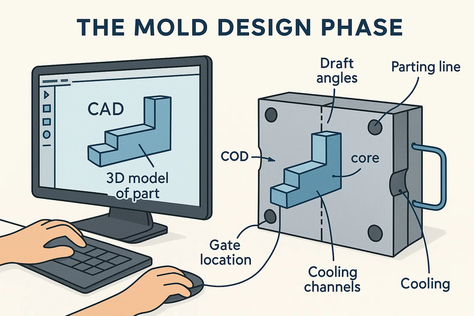 Con una chiara comprensione di come lo stampaggio a iniezione trasforma la plastica grezza in parti finite, ora possiamo apprezzare l'importanza fondamentale del Fase di design dello stampo . È qui che inizia davvero la magia, poiché le idee astratte e gli schizzi 2D si evolvono in un progetto digitale preciso che guiderà la creazione fisica dello stampo. È un processo meticoloso in cui ogni curva, angolo e dimensione della parte del modello di plastica finale è attentamente considerata e tradotta nella geometria dello stampo.