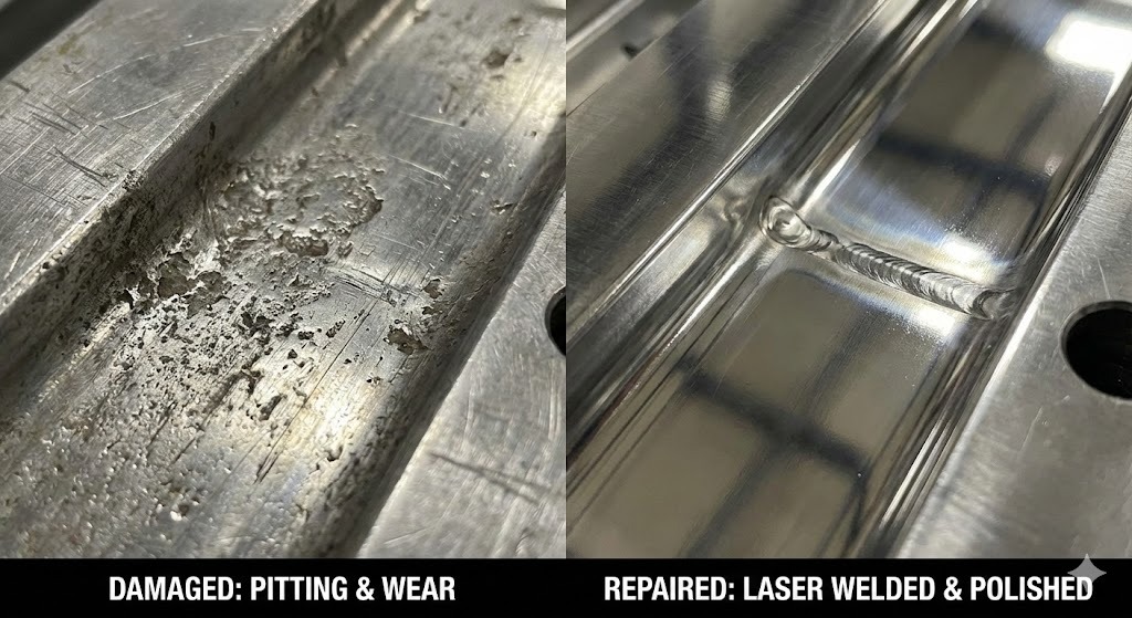 - La soluzione: Tecnici utilizzati Filo laser H13 per ricostruire la linea di giunzione, seguito da a TiN (nitruro di titanio) Rivestimento in PVD.